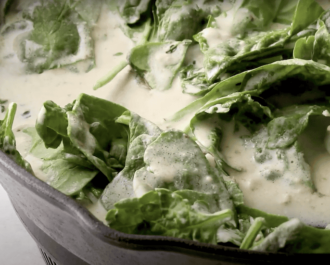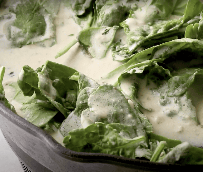 Place 5 ounces of fresh baby spinach leaves in the cream sauce, then stir to wilt leaves slightly, but not fully.