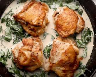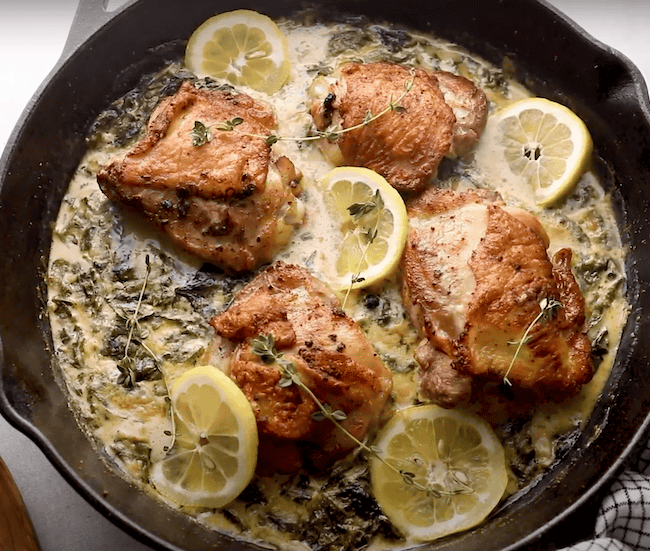 This lemon butter chicken recipe is an easy weeknight dinner that’s become a real favorite for my family, and for reader’s families too! I cook up juicy chicken thighs to tender perfection in a creamy lemon and garlic butter sauce, then finish with fresh spinach. This meal is cooked all in one pan for simplicity, and it’s packed with bright lemon flavor!