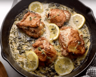 Place the chicken thighs directly in the creamy lemon butter sauce, place the entire pan in the oven, and bake for 25 minutes, or until the internal temperature reaches 165-175°F.