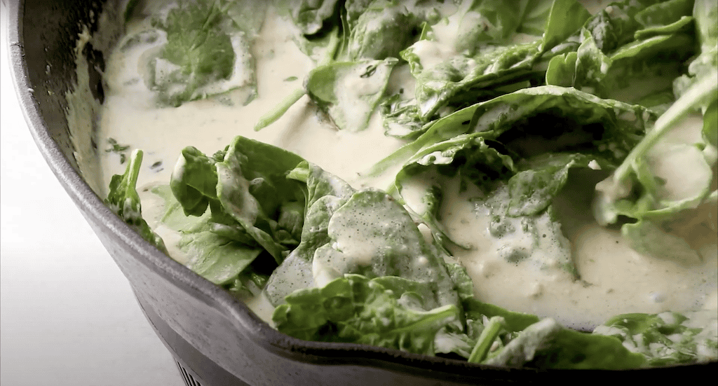 Place 5 ounces of fresh baby spinach leaves in the cream sauce, then stir to wilt leaves slightly, but not fully.