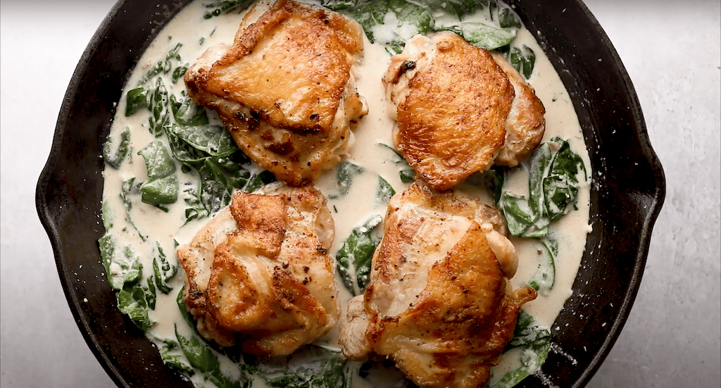Place the chicken thighs directly in the creamy lemon butter sauce, place the entire pan in the oven, and bake for 25 minutes, or until the internal temperature reaches 165-175°F.