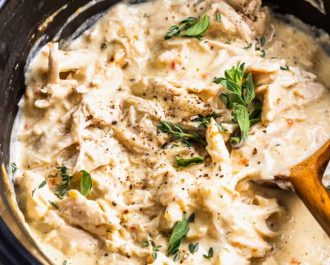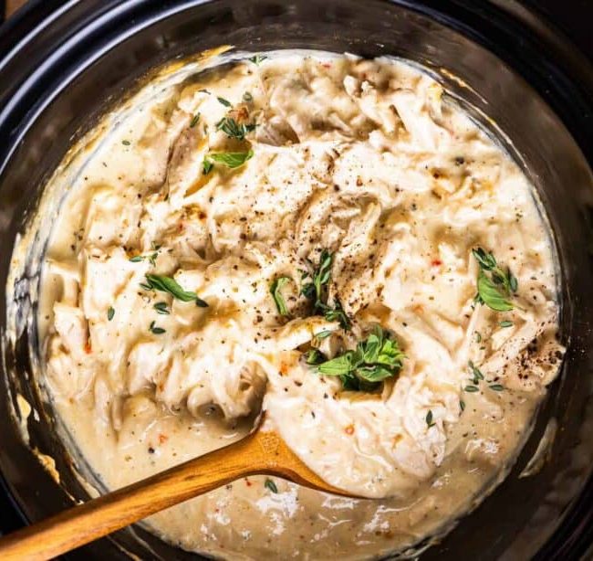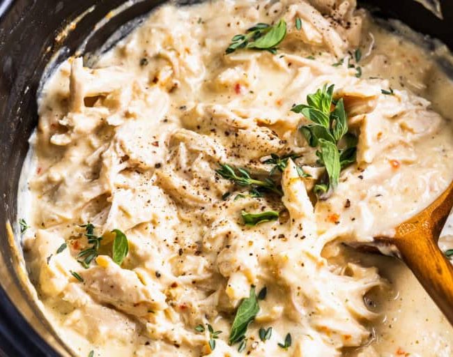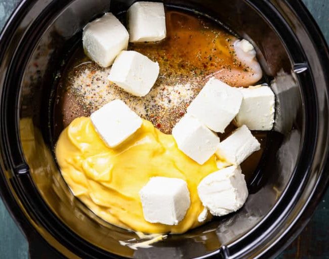 To the pot, add 1 can (10.5 ounces) of cream of chicken soup, 8 ounces of cream cheese chopped into cubes, and ½ cup of chicken broth. Cover and cook on low for 5-6 hours, or on high for 3-4 hours.