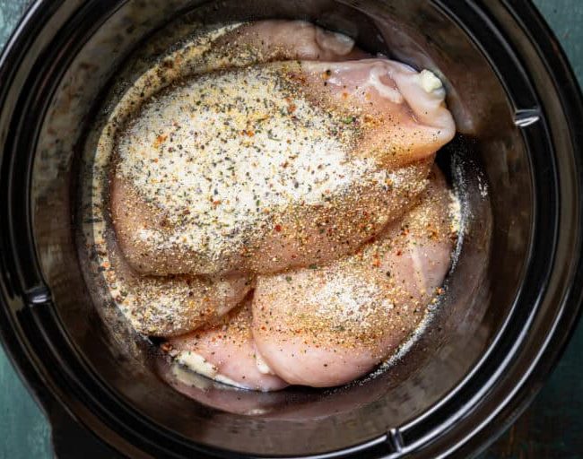 - Place the chicken into the Crockpot and sprinkle the Italian seasoning over the chicken breasts.6 boneless skinless chicken breasts,1.4 ounces Italian dressing seasoning