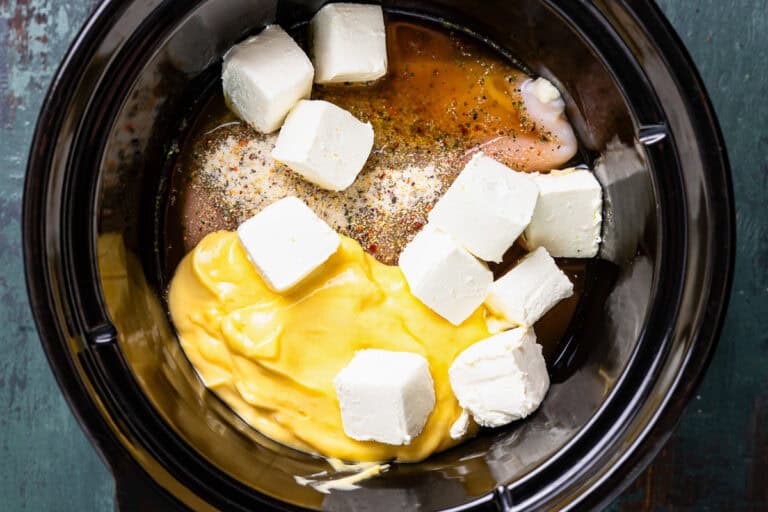 To the pot, add 1 can (10.5 ounces) of cream of chicken soup, 8 ounces of cream cheese chopped into cubes, and ½ cup of chicken broth. Cover and cook on low for 5-6 hours, or on high for 3-4 hours.