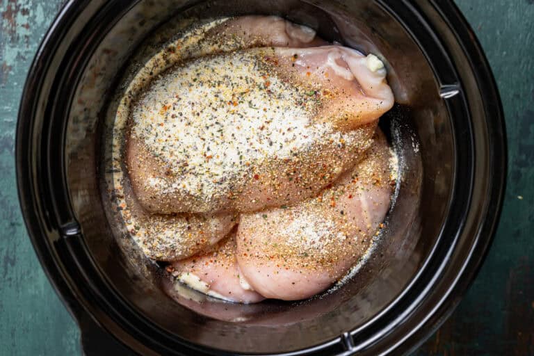 - Place the chicken into the Crockpot and sprinkle the Italian seasoning over the chicken breasts.6 boneless skinless chicken breasts,1.4 ounces Italian dressing seasoning