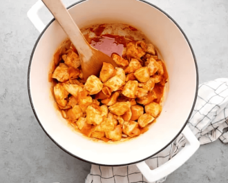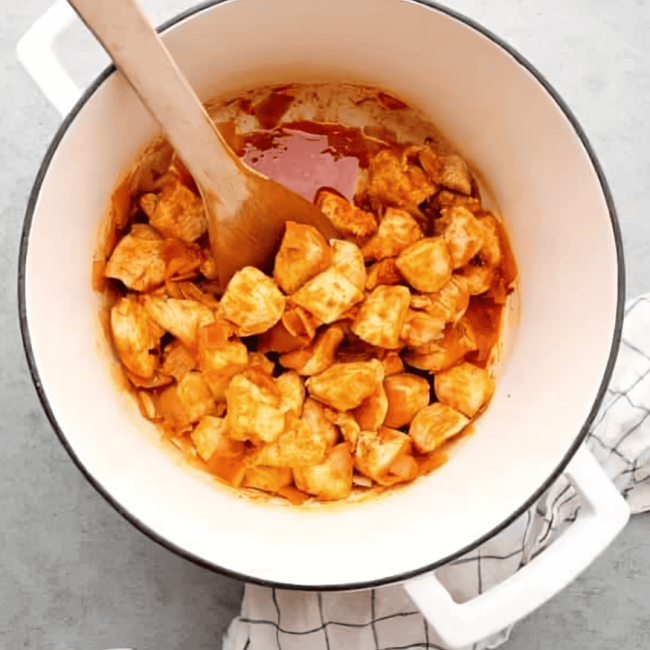 Heat 2 tablespoons of vegetable oil in a large pot or Dutch oven set over medium heat. Add in 2 diced shallots and cook until translucent, about 3-5 minutes. Add in 1½ pounds of cubed boneless, skinless chicken breasts and cook until the surface turns white, then add in 3 tablespoons of red curry paste and sauté, stirring constantly, until the curry paste is fragrant and has deepened in color.