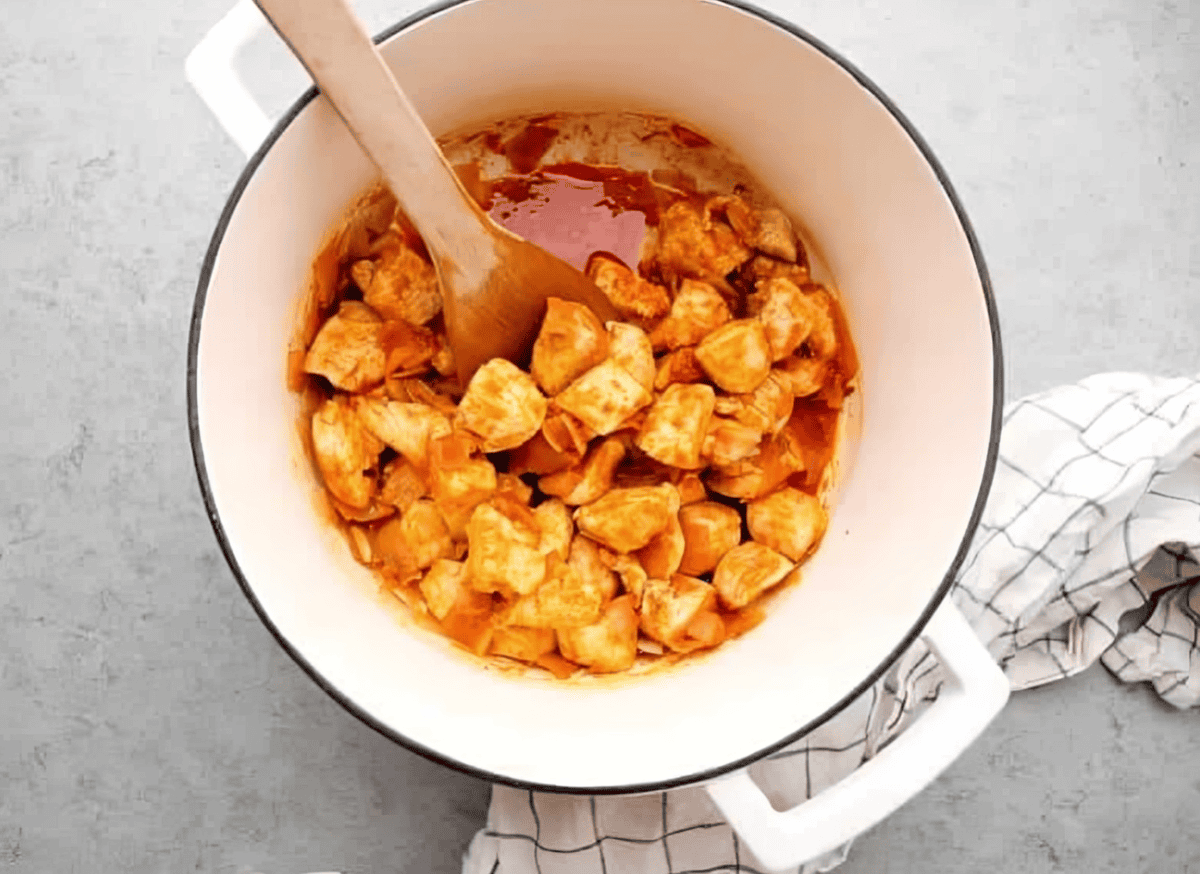 Heat 2 tablespoons of vegetable oil in a large pot or Dutch oven set over medium heat. Add in 2 diced shallots and cook until translucent, about 3-5 minutes. Add in 1½ pounds of cubed boneless, skinless chicken breasts and cook until the surface turns white, then add in 3 tablespoons of red curry paste and sauté, stirring constantly, until the curry paste is fragrant and has deepened in color.